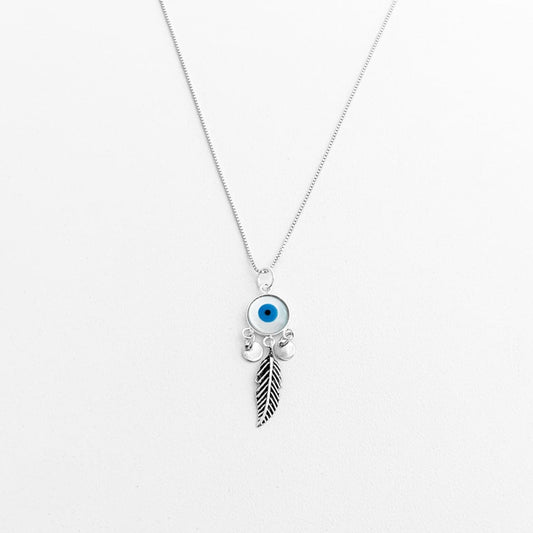 Gargantilha de Olho Grego em Madrepérola com Pena e Medalhinhas - 40cm