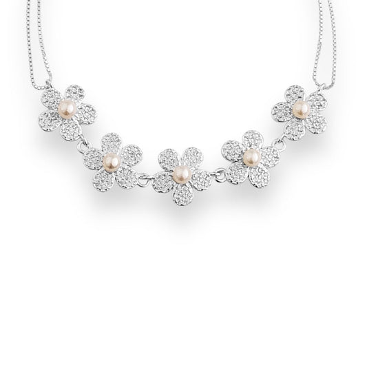 Pulseira de Dois Fios com Flores Cravejadas em Zircônias e Pérola - 17cm
