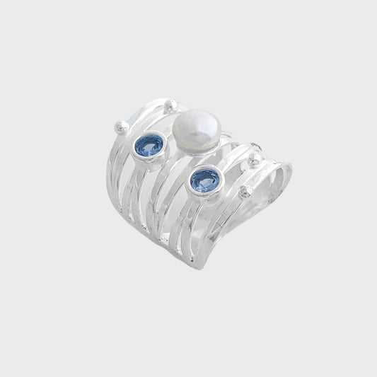 Anel com Aro Trabalhado com Zircônia em Água Marinha e Pérola