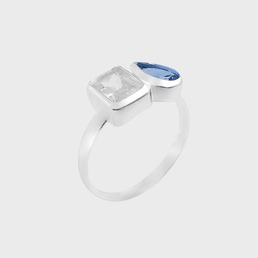 Anel com Retângulo e Gota em Zircônias Brancas e em Água Marinha