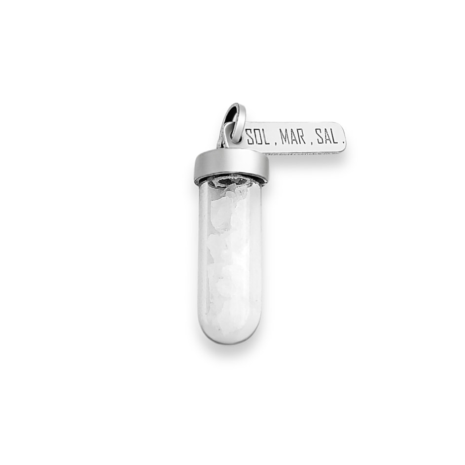 Pingente de Cápsula com Sal Grosso e Plaquinha (Sol, Mar, Sol)