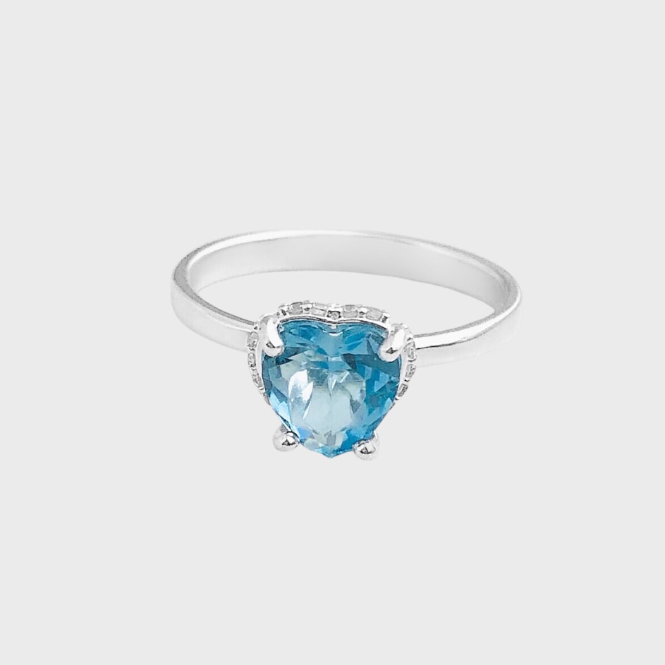 Anel Solitário com Zircônia de Coração em Água Marinha e Zircônias Brancas