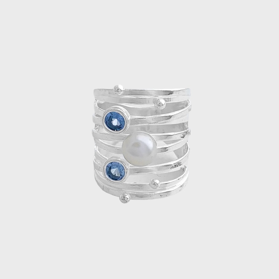 Anel com Aro Trabalhado com Zircônia em Água Marinha e Pérola